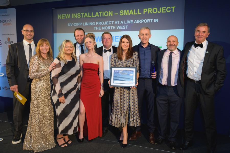 The winning project involved a technically complex UV-CIPP lining installation at a live airport in the North West, where McBreen Enviro UK led the works and S1E supplied the high-performance SAERTEX Liner. The 95m-long sewer presented significant challenges, including a mid-length diameter transition from 900mm to 750mm and severe structural defects such as cracks, collapses, and displacements.